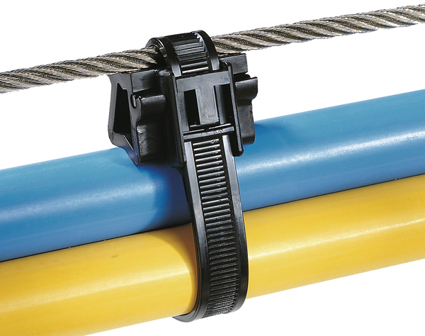 | Application | Ces lanières ont été conçues pour permettre la fixation de conducteurs électriques ou câbles divers à un porteur mécanique. Il est aussi possible de les utiliser pour router en parallèle des câbles et durites. De par leur conception, la tête de ces lanières fait office d’écarteur pour bien séparer les câbles à maintenir du câble porteur. |